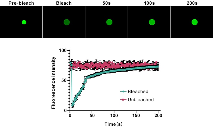 在荧光漂白回复实验(FRAP)中通过精密地调节光源强度与漂白区域的选定,BZ 系列的高强度LED光源在关闭防漂白功能后,可以依据研究需求,灵活调整光源参数,确保漂白过程既充分又不过度,从而获取到更为精确的漂白的实验数据。