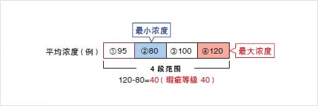 - 在检测区域内,将各种尺寸的小区域(段)移动其段大小的 1/4 量的同时,进行平均浓度的测定。